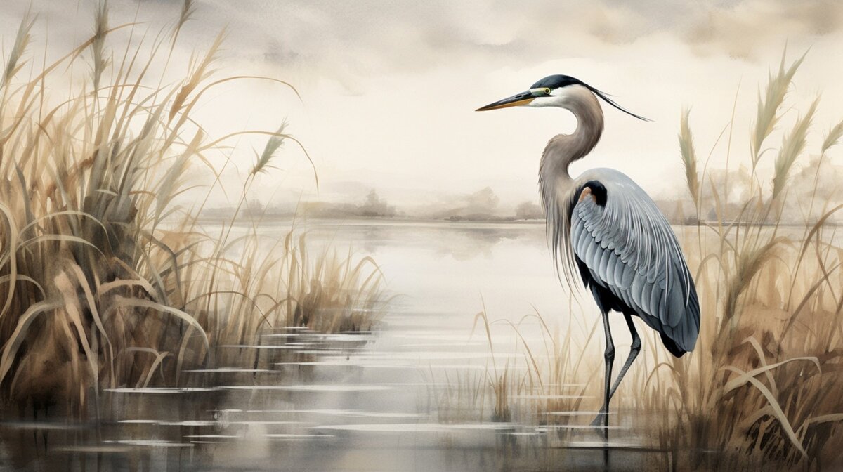 Obraz: Czapli modra na płyciznach mokradła otoczona trzcinami